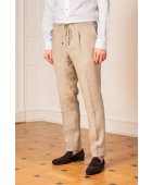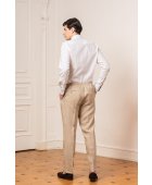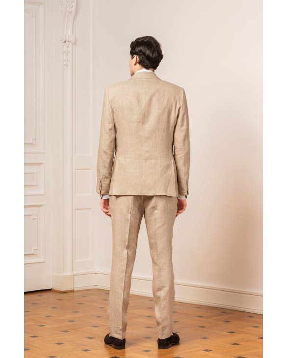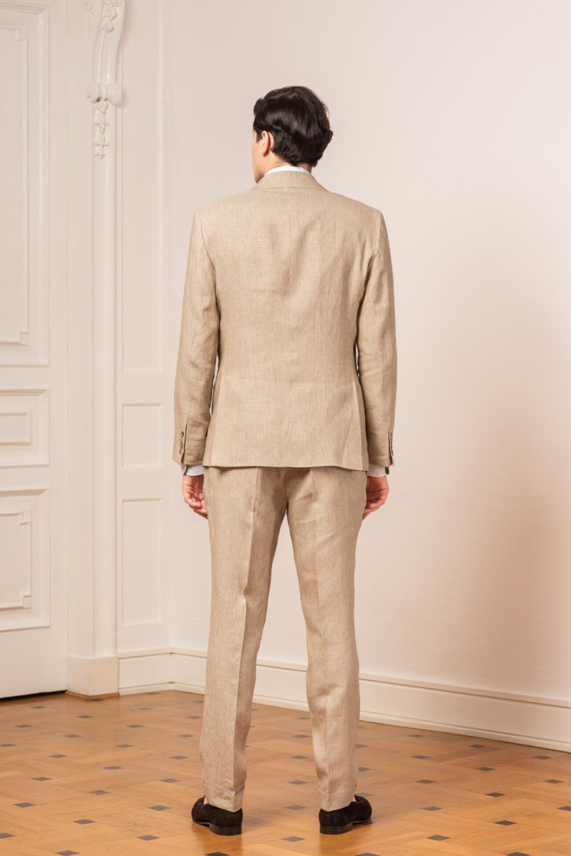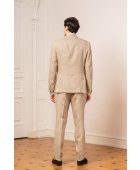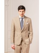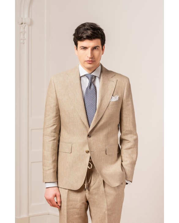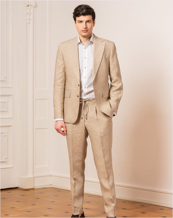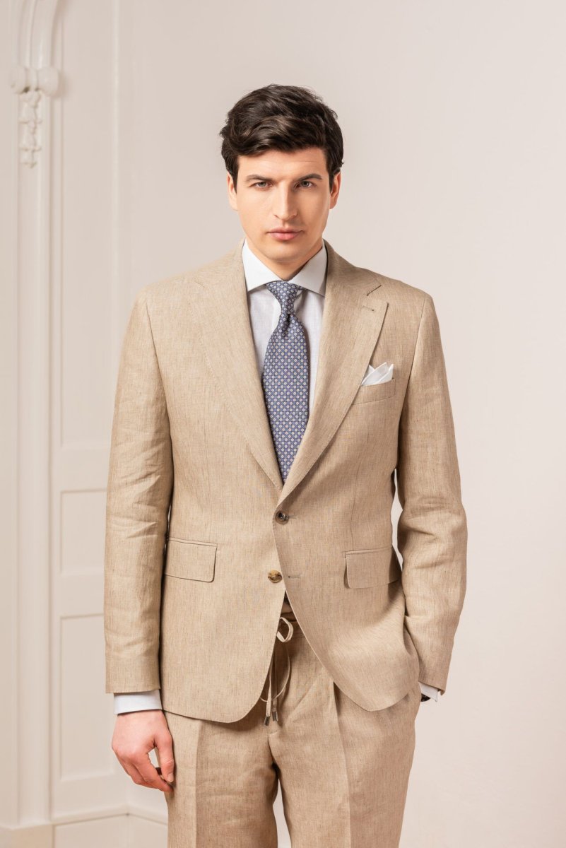 Dla poszukujących typowo wakacyjnego, lekkiego i przewiewnego garnituru na nieformalne okazje VAN THORN przygotował beżowy, lniany garnitur. Klasyczna marynarka zapinana na dwa guziki, z otwartymi klapami w połączeniu ze sportowym krojem spodni wiązanych w pasie naturalnie wpiszą się w luźne, skąpane w słońcu spotkania towarzyskie lub wyjazdy wakacyjne.