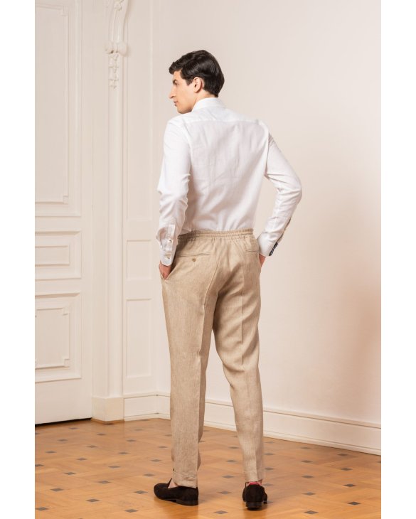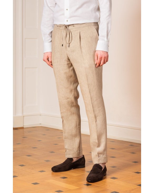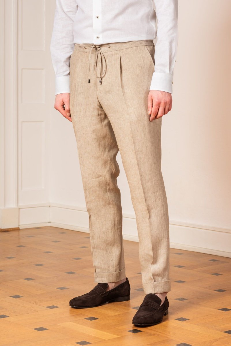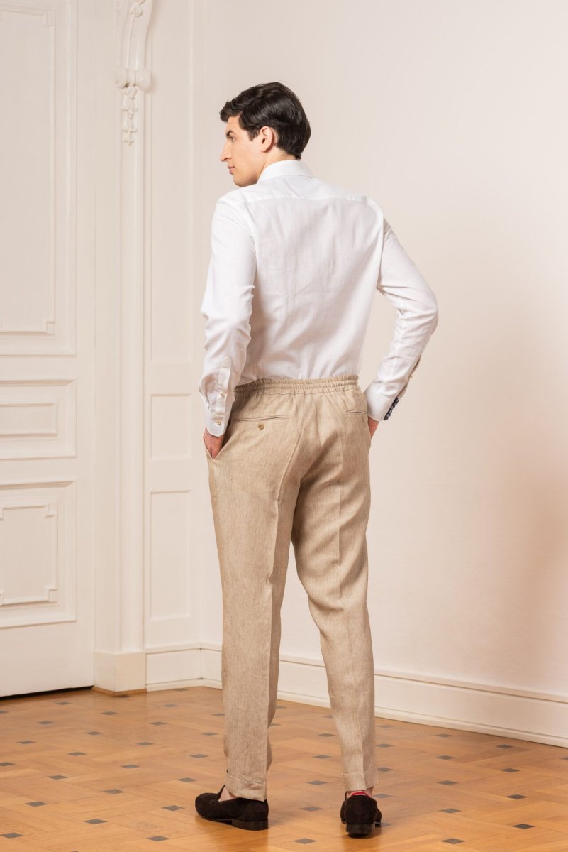 Oczywiście każdy zdaje sobie sprawę z gniotliwego charakteru lnianych tkanin. Jednak w okresie letnim można to sobie wybaczyć, ponieważ dzięki swojej przewiewności lniana tkanina gwarantuje komfort trudny do osiągnięcia dla innych materiałów. Naturalnie wysoka absorbcja wilgoci przez len oraz jego właściwości antybakteryjne gwarantują komfort i casualową elegancję przez cały czas. A nieformalny charakter spodni i klasyczny krój marynarki ułatwiają łatwe dekompletowanie tego zestawu w zależności od potrzeb, co nadaje lnianemu garniturowi niezwykle szeroką gamę zastosowań.